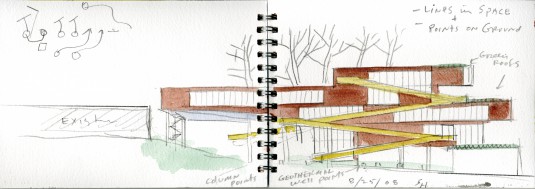 Steven Holl : Tất cả mọi thứ mà tôi đang thiết kế. Cậu có thể làm được điều gì khác ? Người ta thường tự hỏi làm thế nào mà tôi có thể vẽ được rất nhiều chi tiết. Tôi không vẽ các bản vẽ chi tiết. Tôi chỉ cần làm một bản phác ra ý tưởng. Cậu nhìn vào các dự án của chúng tôi mà xem. Đi và ngắm Trung tâm thể thao tại Đại học Columbia. Khi cậu đi lên đó và xem các chi tiết, như những lan can thẳng đặc biệt này đón nhận những tia sáng mặt trời theo những cách khác nhau, tôi đã vẽ điều này trong bản vẽ màu nước.