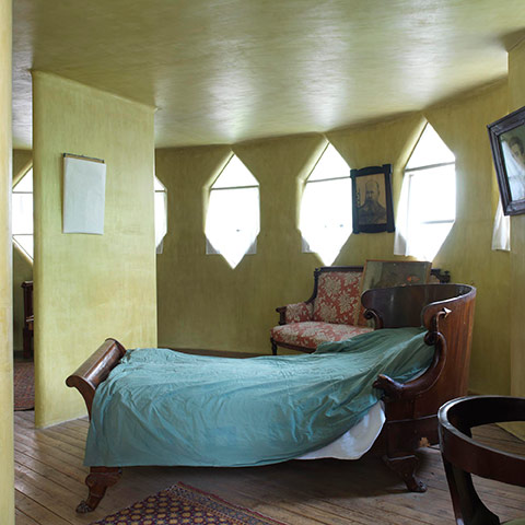 Công năng của nội thất bố trí hiệu quả, với phần lớn các không gian sinh hoạt như bếp và phòng tắm nằm trên tầng chính. Một hình xoắn ốc cuộn lên trên thể hiện sự đa dạng của không gian từ các mặt phẳng thấp đến cao, đến một không gian studio thông tầng và sân trên mái. Một cầu thang uốn lượn dẫn lên tầng hai nơi đặt phòng ngủ và phòng khách. Một điều thú vị là các phòng ngủ nằm ở phần phía sau không hoàn toàn tách rời nhau. Thay vào đó, Melnikov phân chia không gian qua những bức tường lửng nhằm định nghĩa những diện tích cụ thể, trong khi duy trì một mặt bằng gần như mở cho phép ánh nắng mặt trời tràn ngập bên trong không gian nội thất. Tầng ba là một không gian studio với chiều cao gấp đôi ở hình trụ phía sau. Khác biệt rõ ràng với những không gian khác, không gian cao gấp đôi này được đón nhận những tia nắng xuyên qua các cửa sổ hình lục giác. Không gian này định nghĩa và thêm vào sự tin tưởng của tác giả về việc sáng tạo ra các không gian thể nghiệm sử dụng các vật liệu phi chuẩn – ánh sáng và bóng đổ – trong thiết kế tổng thể .