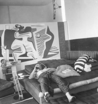 Le Corbusier bên cạnh một trong số các bức tranh.
