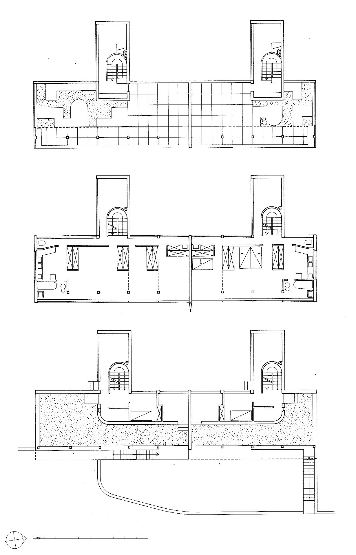 Ba tầng nhà dành cho hai gia đình. Mặt bằng của cả hai đơn vị nhà là gần như đối xứng và mỗi đơn vị được phục vụ bởi một cầu thang mọc lên ở trung tâm. Đi vào tầng trệt, phía dưới của khối nhà được đỡ bằng những cây cột. Phía bên trong là một hành lang tiếp cập với phòng để đồ, lò sưởi, kho để than, phòng giặt, phòng người giúp việc và phòng kho. Tầng trên là không gian sinh họat chính. Ở đây có phòng ăn phía sau cầu thang và bếp cùng phòng tắm ở phía bên kia. Bao trùm phần lớn mặt bằng là không gian sống rộng rãi, linh họat và không gian ngủ, tràn ngập ánh sáng từ những băng cửa sổ dài trên mặt đứng chính. Tầng mái nổi bật với khu vườn ngòai trời và sân phơi nắng. Đáng lưu ý là khu thư viện và học tập được giấu phía sau của cầu thang, vị trí của phòng này cho phép người sử dụng có thể làm việc muộn đên khuya mà không ảnh hưởng đến những người khác ở tầng dưới.