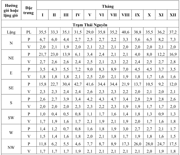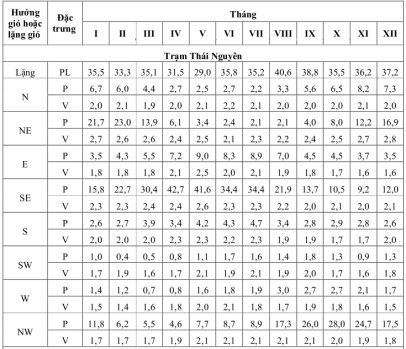 Previous Image Next Image 3 Bảng 1. Tần suất lặng gió (PL%) tần suất (P%) và vận tốc gió (V m/s) trung bình theo 8 hướng tại Thái Nguyên