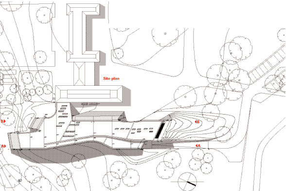 Tòa nhà mới với mặt tiền bằng kính phản chiếu cảnh quan xung quanh và thoáng nhìn được một phần bên trong, có độ mờ đối trọng bởi một lớp bao màu đen làm bằng bê tông đổ tại chỗ bao quanh, được bổ sung bởi nhiều tình huống xử lý đào và kè hoàn thành trên mặt đất.