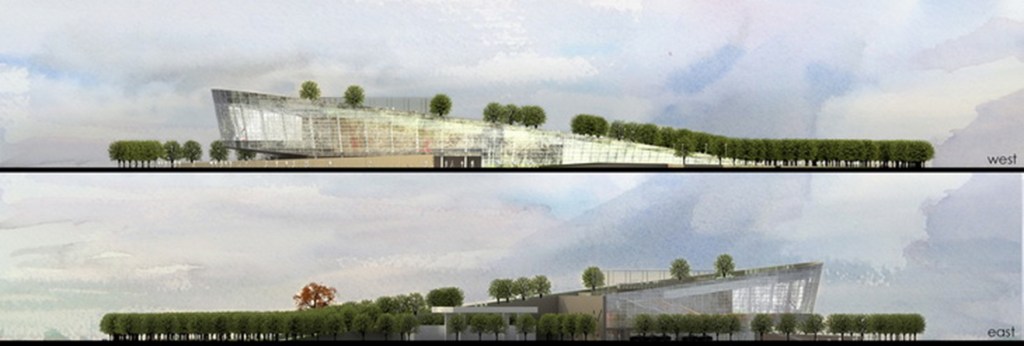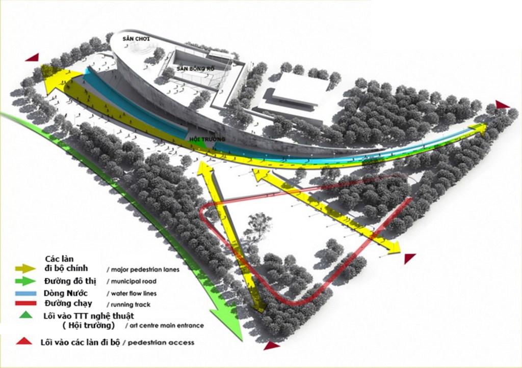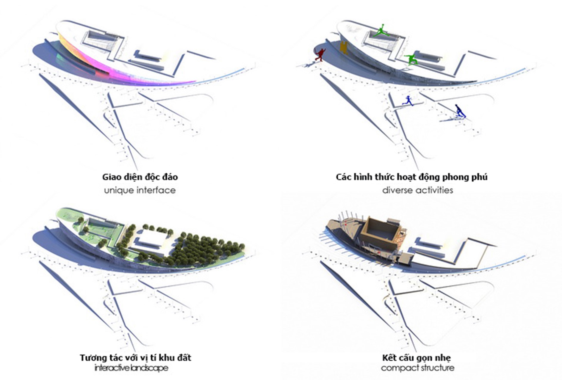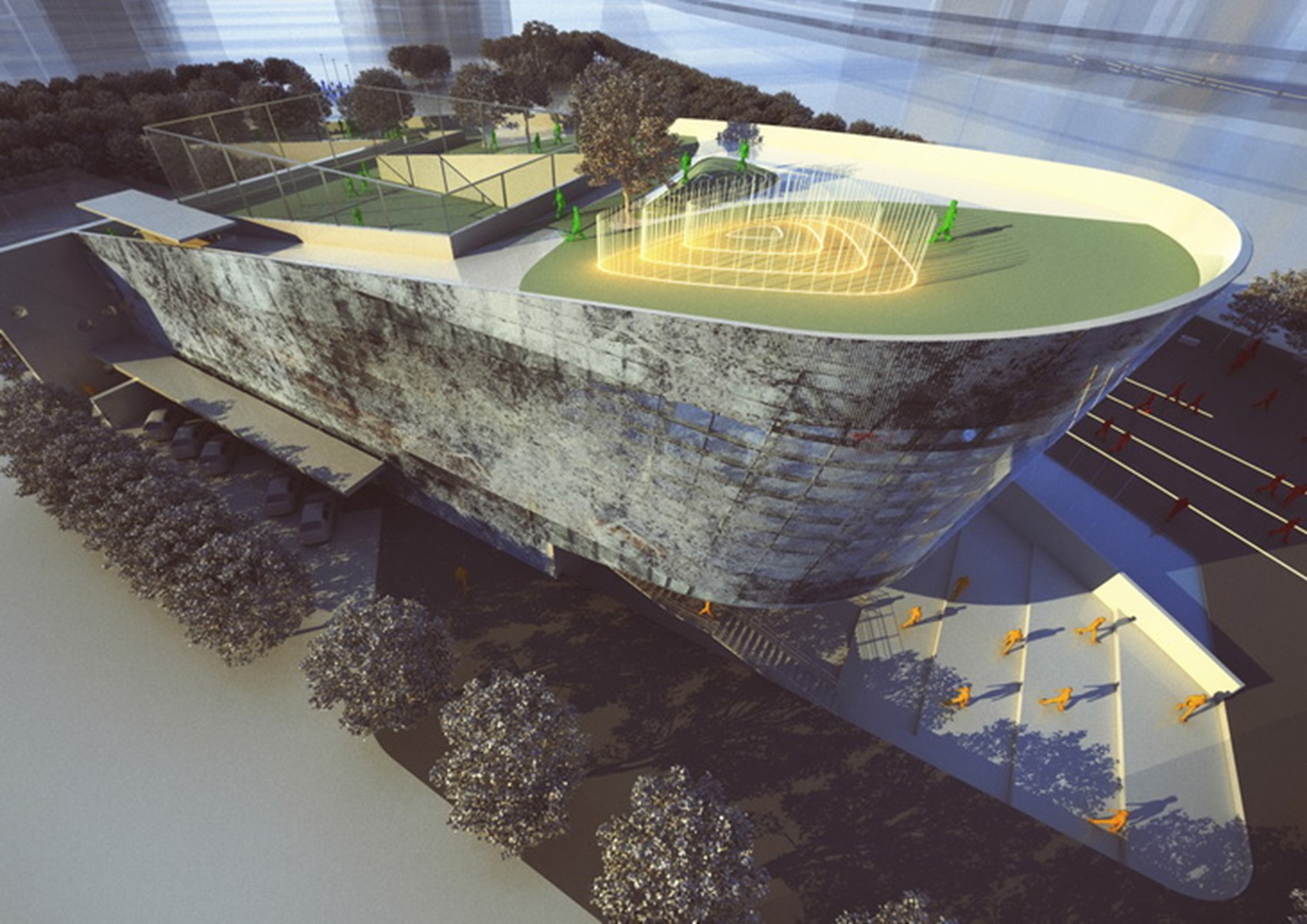 Mục đích thiết kế là tạo ra một điểm nhấn cho khu vực với cảm giác công nghệ cao và đồng thời là trung tâm cho các hoạt động và sự kiện công cộng đa dạng. Vị trí này theo ý tưởng của người thiết kế nên là lá phổi xanh của khu vực, được bao quanh bởi các tuyến đường trên cao và các tòa nhà cao tầng. Vì vậy giải pháp được đưa ra là toàn bộ phần mái công trình được bố trí như một sân dốc, bên trên trồng cây và tổ chức các sân chơi. Từ trên không nhìn xuống, công trình kiến trúc ẩn mình hoàn toàn trong công viên cây xanh và như trở thành một với đất.