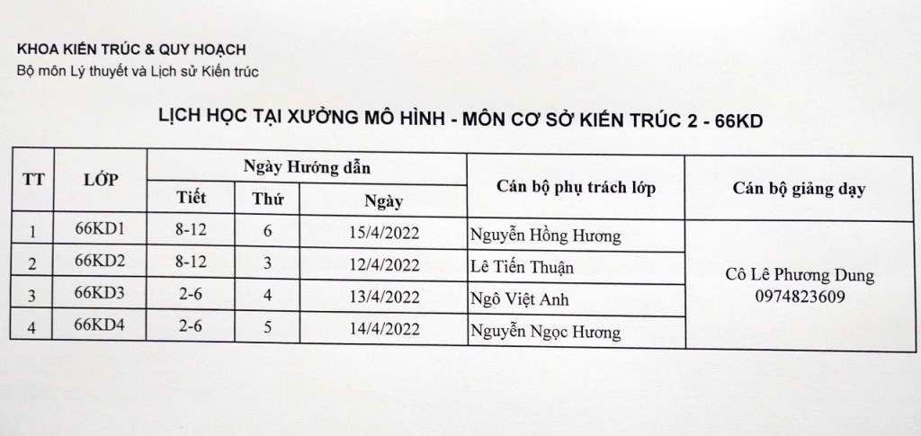 Môn Lịch sử kiến trúc: Cô Vũ Thị Ngọc Anh, sđt: 0904 449 103