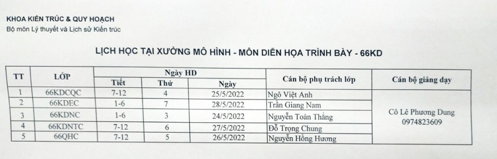 THÔNG BÁO LỊCH HỌC TẠI XƯỞNG MÔ HÌNH MÔN DIỄN HỌA TRÌNH BÀY 66KD HỌC KỲ 2 NĂM HỌC 2021-2022 Share this: Click to share on Facebook (Opens in new window) Facebook Click to email a link to a friend (Opens in new window) Email Click to print (Opens in new window) Print Click to share on LinkedIn (Opens in new window) LinkedIn Like Loading... Related