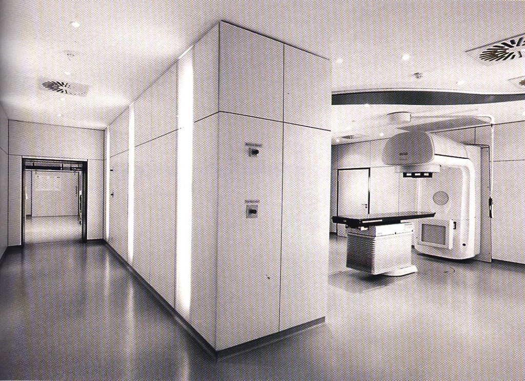 Phòng này là hạt nhân của khoa, trong phòng có bố trí một máy điều trị xạ phẫu. Trước đây, người ta đã sử dụng hai phương pháp điều trị các khối u bằng dao Gamma (Gamma Knife) và máy gia tốc tuyến tính. Tuy nhiên hai phương pháp này cũng có những nhược điểm nhất định. Hiện nay với kỹ thuật mới nhất, trong một số bệnh viện đã sử dụng hệ thống CyberKnife (Dao Cyber). CyberKnife là một máy gia tốc tuyến tính phát ra chùm tia X có mức năng lượng ổn định là 6 MeV và được gắn trên một cánh tay robot, nhờ cánh tay robot này mang máy gia tốc có thể chiếu tia điều trị các tổn thương có hình thái khác nhau, ở các vị trí khác nhau trong cơ thể và bảo vệ được các mô lành xung quanh – đó chính là các ưu điểm vượt trội của CyberKnife so với những thiết bị trước đó. Khi thiết kế và xây dựng phòng này cần lưu ý toàn bộ kết cấu bao che: tường, trần, nền của phòng điều trị phóng xạ phải được đổ bằng bê tông cốt thép dày từ 600 – 1200 mm và được dát chì, sau đó dùng các vật liệu ốp lát trang trí phía ngoài như gỗ, sơn hoặc ốp đá. Chú ý các thiết bị khung thép, ống đi cáp cấp điện, ống cấp nước, các đường ống cấp khí… cần có những biện pháp phòng chống các chất phóng xạ phát tán ra bên ngoài. Nội thất trong phòng cần được thiết kế bởi các gam màu nhẹ nhàng không gây căng thẳng, trên tường có thể treo những bức tranh phong cảnh đồng quê tạo cho bệnh nhân những cảm giác gần gũi bớt đi sự sợ hãi bởi các thiết bị lạnh nhạt tạo lên (xem Hình1). Diện tích tối thiểu của phòng điều trị phóng xạ là 36m2, trần có độ cao tối thiểu là 3,3m. Hệ thống cửa phải thiết kế theo tiêu chuẩn riêng, dạng cánh trượt tự động có các lớp chống phóng xạ và phải được lắp hệ thống đèn cảnh báo phóng xạ khi đang làm việc. Tóm lại trước khi thiết kế phòng này, người thiết kế cần phải tham khảo các ý kiến của các chuyên gia trong lĩnh vực này (các kỹ sư vật lý và các bác sỹ chuyên ngành) để đưa ra các giải pháp an toàn và tốt nhất.