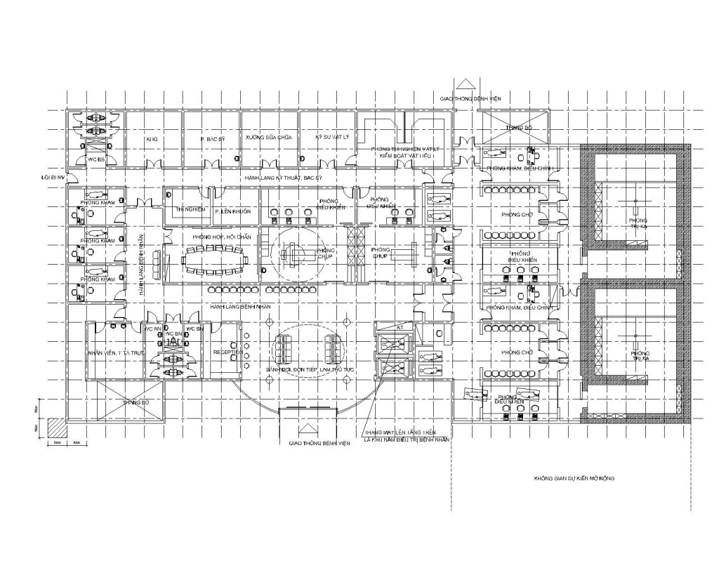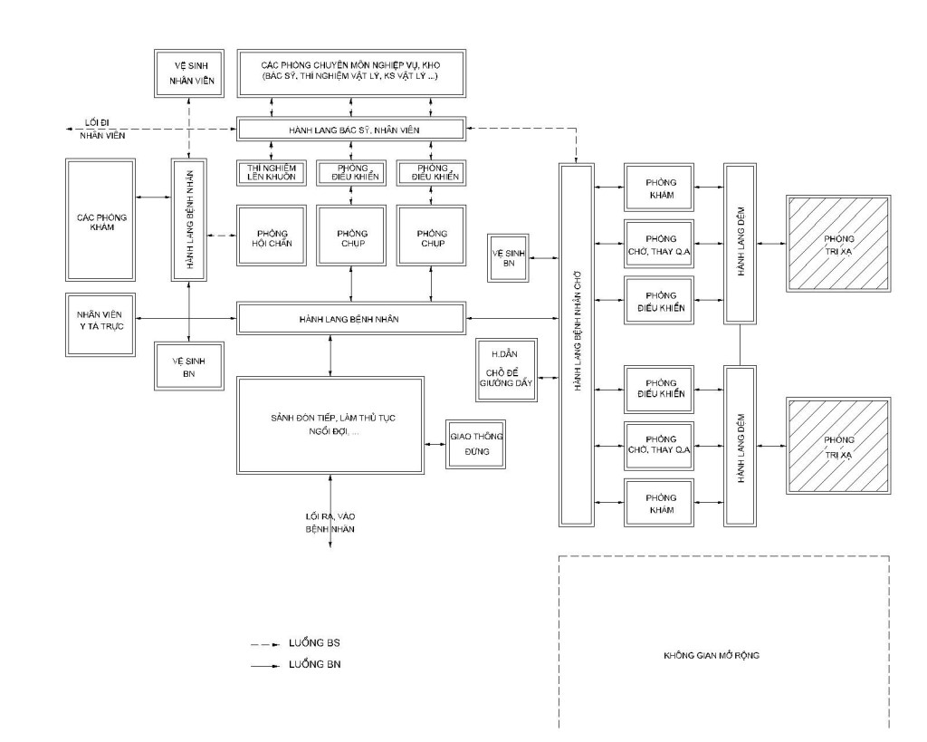 Khi thiết kế xây dựng không gian khoa điều trị bằng phương pháp phóng xạ trong các bệnh viện cần phải có sự kết hợp chặt chẽ của Nhà đầu tư (quản lý), Nhà sử dụng (BS, KS), Nhà thiết kế (các KTS, KS), Nhà thầu xây dựng, Nhà cung cấp thiết bị nhằm mang lại hiệu quả tốt nhất để phục vụ Người bệnh. Đó là sự ràng buộc chặt chẽ giữa bệnh nhân – bác sỹ – thiết bị – kiến trúc và môi trường … Việc nghiên cứu ban hành thiết kế điển hình khoa điều trị bằng phương pháp phóng xạ theo phương pháp thiết kế Catalog nhằm mang lại sự chính xác cao cho các thiết bị đặt trong các không gian kiến trúc. Đồng thời dây chuyền chức năng phải tuân thủ chặt chẽ hai luồng một chiều sạch và bẩn (luồng bác sỹ và bệnh nhân).