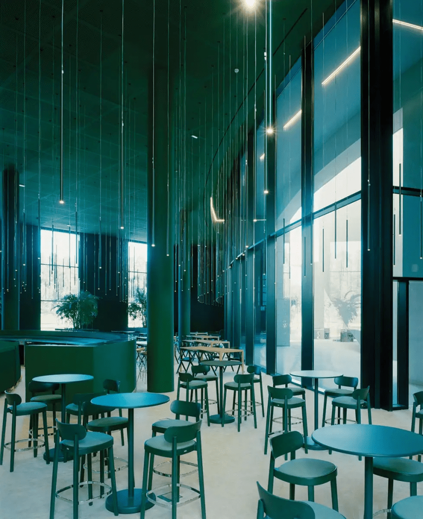Màu sắc tràn ngập đã được studio Catalonia sử dụng để tạo hiệu ứng tuyệt vời để làm cho kiến trúc sống động — hãy xem xét màu xanh nửa đêm đậm đà của Castillo de Kafka và màu đỏ và chàm của La Muralla Roja, lấy cảm hứng từ Maghrebi casbahs. “Đó là một phần trong DNA của chúng tôi và là một chiến lược mà chúng tôi thường xem xét” Bofill nói, đưa một bảng màu ưa thích của RBTA. “Đối với chúng tôi, không gian trở nên mạnh mẽ hơn khi có một màu sắc thay vì một thứ chắp vá – nó giúp mọi người xác định một vị trí đặc biệt trong tâm trí của họ.” Màu xanh lá cây cũng mang ý nghĩa văn hóa trong bối cảnh này: mối liên kết của nó với thiên đường và sự tinh khiết trong Hồi giáo, ngôi sao năm cánh trên quốc kỳ của Marocco và ngói zellige tô điểm các nhà thờ Hồi giáo nổi tiếng nhất của đất nước.