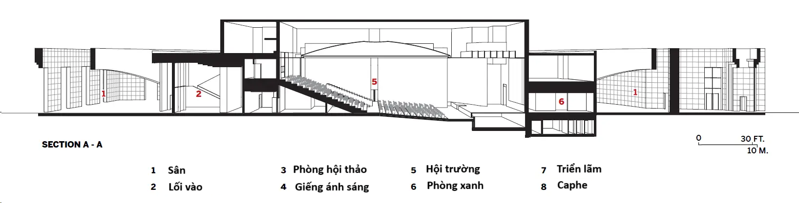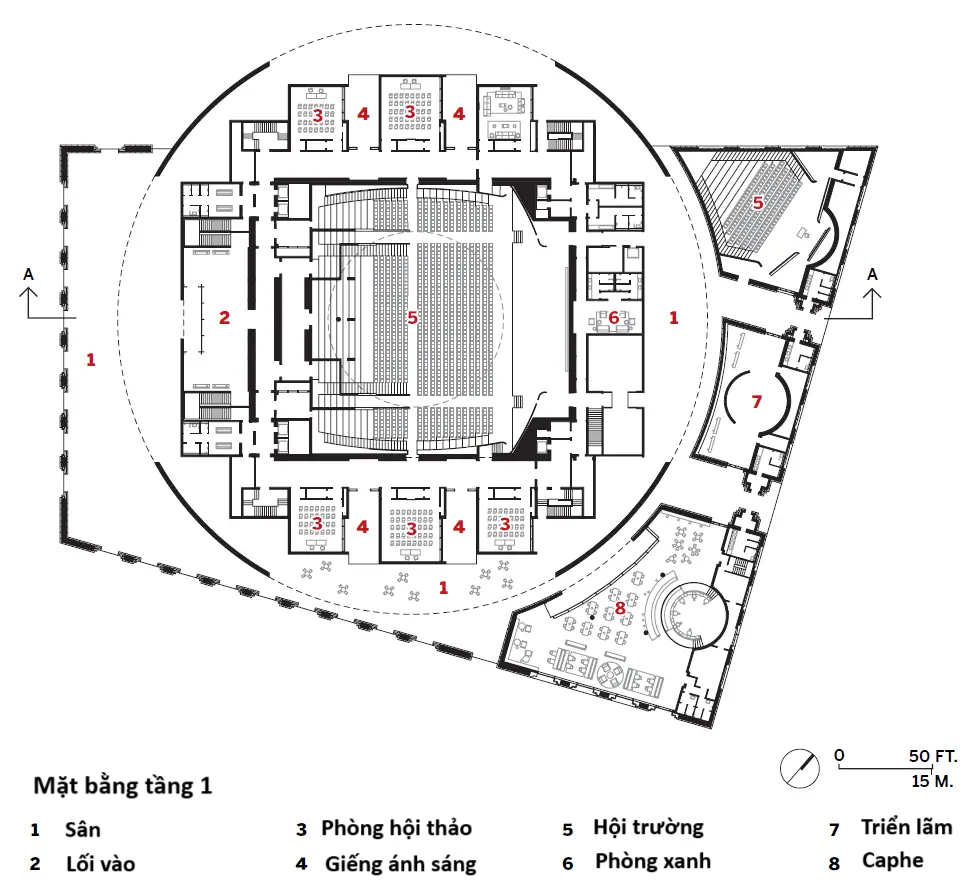 “Điều quan trọng đối với chúng tôi là không quá chăm chú về tính địa phương, bởi vì điều đó có thể mang đến một cái gì đó sao chép hình thức” Pablo Bofill nói. “Ở Morocco, luôn có một thứ kiến trúc bên trong – đầu tiên bạn có thể đi qua một cánh cửa nhỏ, và sau đó có thể có cái sân, và rồi sau đó lại có thể có một cánh cửa khác, v.v.”, ông giải thích về cấu trúc hiện có và mối bận tâm của nhóm nghiên cứu đối với tính hình học và chuỗi trình tự trong Trung tâm Hội nghị. Theo đó, đằng sau các lớp không gian đồng tâm chính là viên ngọc ẩn giấu của dự án: một giảng đường màu ngọc lục bảo, được chiếu sáng bởi một mái vòm thạch cao trắng trên cao mang lại cho căn phòng một vẻ kịch tính ấn tượng.