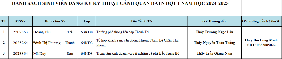 Những sinh viên nào đăng ký phần kỹ thuật cảnh quan liên hệ ngay thầy hướng dẫn kỹ thuật. Mọi thắc mắc, sinh viên lên phòng 509.A1 để được giải đáp.