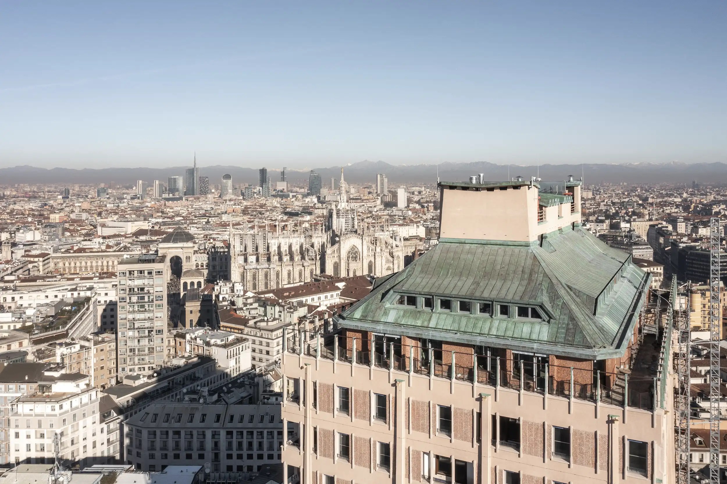Đường viền diềm mái cũng được dọn dẹp sạch sẽ. Khu “rừng” các ăn-ten tua tủa đã biến mất; Velasca nay khắc hoạ lên bầu trời một đường nét kiến trúc tinh gọn, ngoại trừ hai phòng máy inox giấu kín phía sau bệ mái mansard phức tạp. “Bạn gần như chẳng nhận ra chúng,” Asti khẳng định, “Chúng tan biến vào sắc xanh bầu trời.”